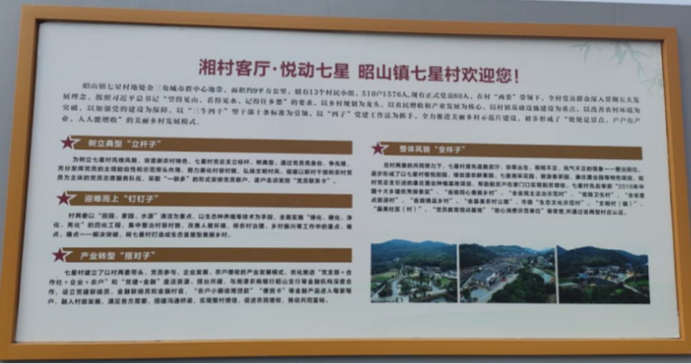 湘潭市岳塘区昭山镇七星村位于长株潭城市群中心地带,南与株洲交界,东与长沙交界。为守护好一方绿水青山,七星村坚持不挖山、不填塘、不砍树、不改直道路、不截断河道,从提质村落生态、保护民俗传统、引导产业发展、完善旅游设施等多方面着手开展美丽乡村建设,打造了一个森林覆盖率达72%的原生态美丽村庄。2018年,七星村被命名为第八批湖南省民主法治示范村(社区);2019年12月25日,被评为国家森林乡村;2020年1月3日,入选第一批湖南省乡村旅游重点村;2021年3月25日,被湖南省文明委授予“2020届湖南省文明村镇;2022年6月28日,入选全国乡村旅游重点村推荐名单。
