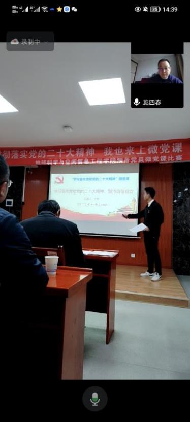疫情的脚步并没有阻止我们前进的步伐,冬日凛冽的寒风伴舞着赛手们斗志昂扬的精神。为深入学习贯彻党的二十大精神,检验预备党员对二十大精神的领会,11月29日下午,无码破解 举办了线上线下的“贯彻落实党的二十大精神,我也来上微党课”比赛决赛活动。担任此次的评委有线上的学院党委书记龙四春,有线下的学院院长任伯帜、党委副书记罗玺、地理党支部书记李振国、地信系党支部书记陈新保、测绘系党支部书记张立亚、地空重点实验室党支部副书记唐志光。此次微党课比赛活动由学院党委专职组织员刘俊策划组织,分初赛与决赛,今天下午的决赛由学院学生党校管理部部长傅颖主持,党校工作人员、学院全体预备党员参会。