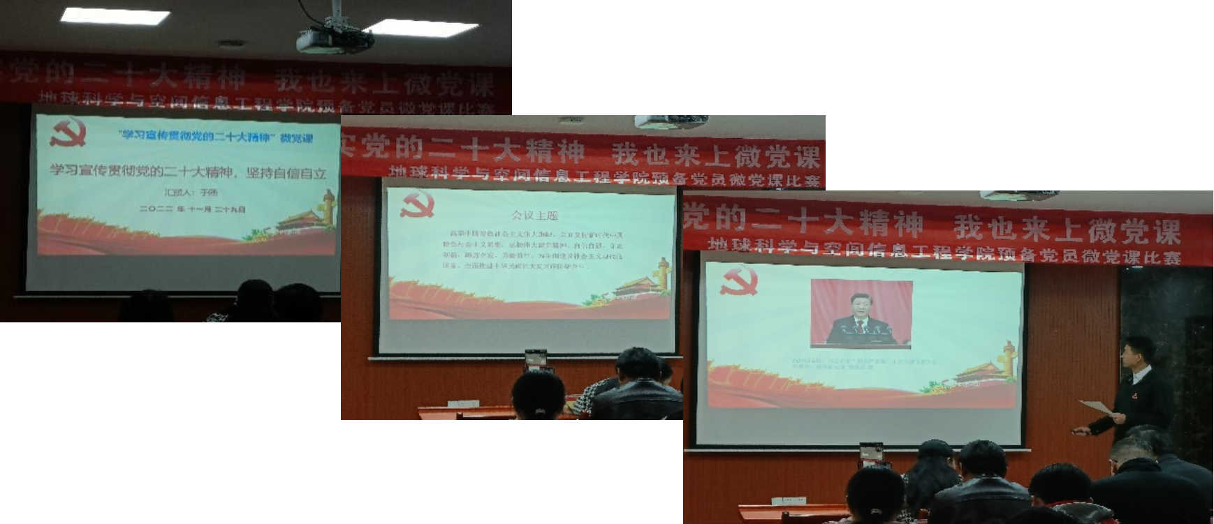 学习宣传贯彻党的二十大精神,坚持自信自立,地质地理研究生学生党支部书记于熙带头讲课。在党的二十大精神的激励下,在场的预备党员和发展对象均深受触动和鼓舞,纷纷表示会一如既往的严格的要求自己,坚持自立自强,始终把党的二十大精神落实到自己的学习生活中。