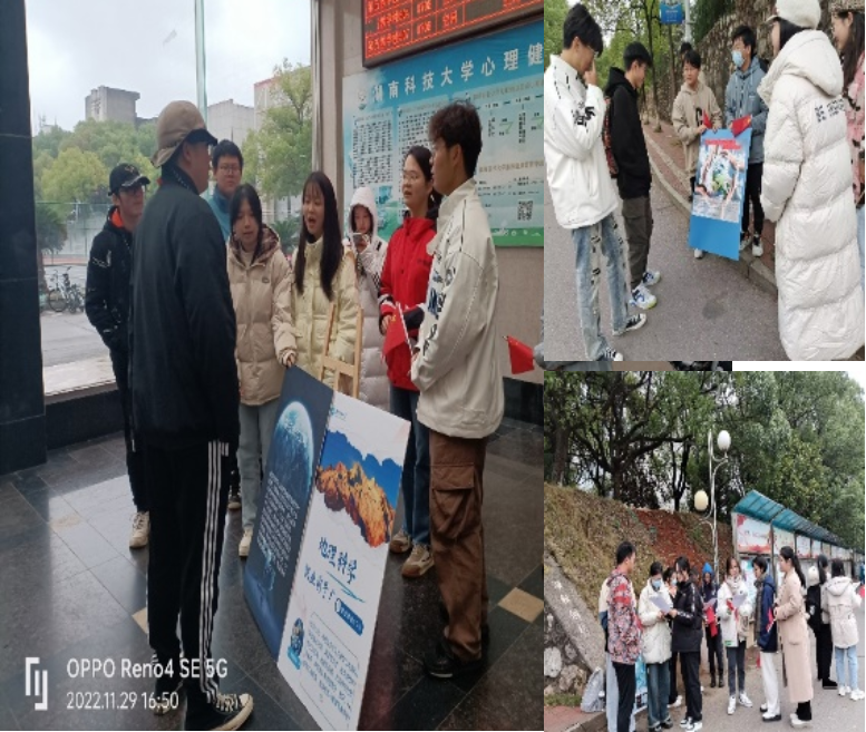 为把无码破解 专业知识普及,学院组织2022年下半年入党积极分子共143名,分为十个小组并在学校的南北校区向在校师生进行专业知识科普,如:桥的秘密、不会迷路的小蛮驴、石头也有另一面、3S中的测绘和智慧城市建设中的地理信息等专业知识。