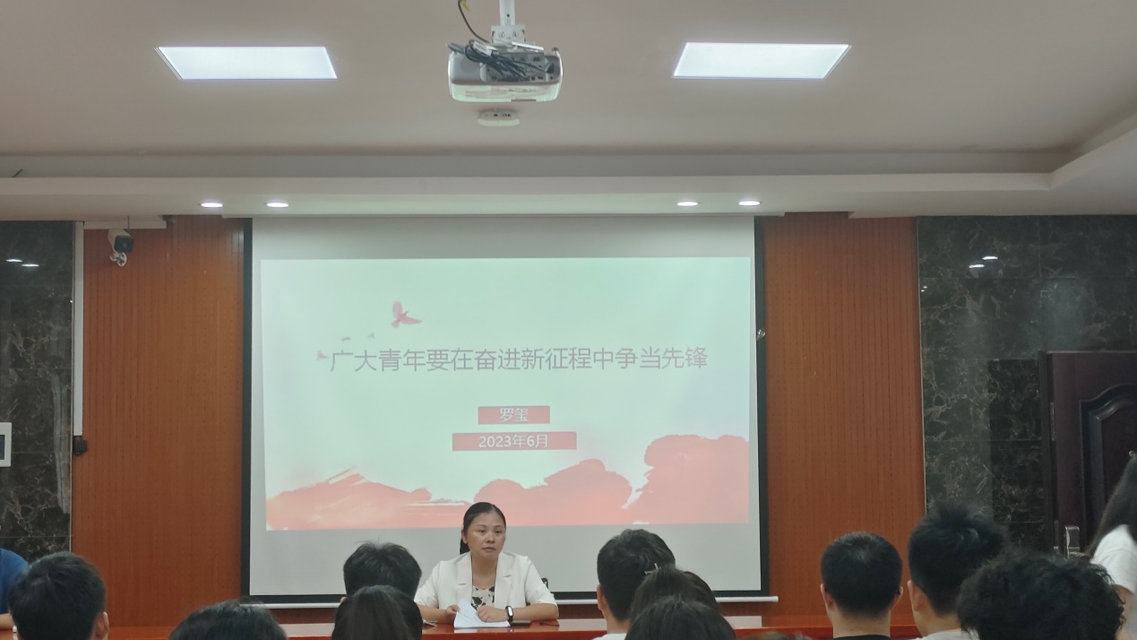 授课前,罗书记给毕业生党员播放了党的好儿女黄文秀的党性教育片。接着以“广大青年要在奋进新征程中争当先锋”为主题为全体学生党员讲授党课。她强调,新时代青年要牢记总书记嘱托,深刻领悟“先锋分子”的内涵要求,发挥好青年先锋作用,勇担时代赋予的历史使命,争做有理想、敢担当、能吃苦、肯奋斗的新时代让党和人民需要、党和人民放心的先锋分子。她勉励毕业生党员同志争做具有远见卓识、政治信仰,敢于斗争、不怕牺牲,胸怀坦荡、忠诚于党,不谋私利谋解放,不畏艰难、脚踏实地的青年。