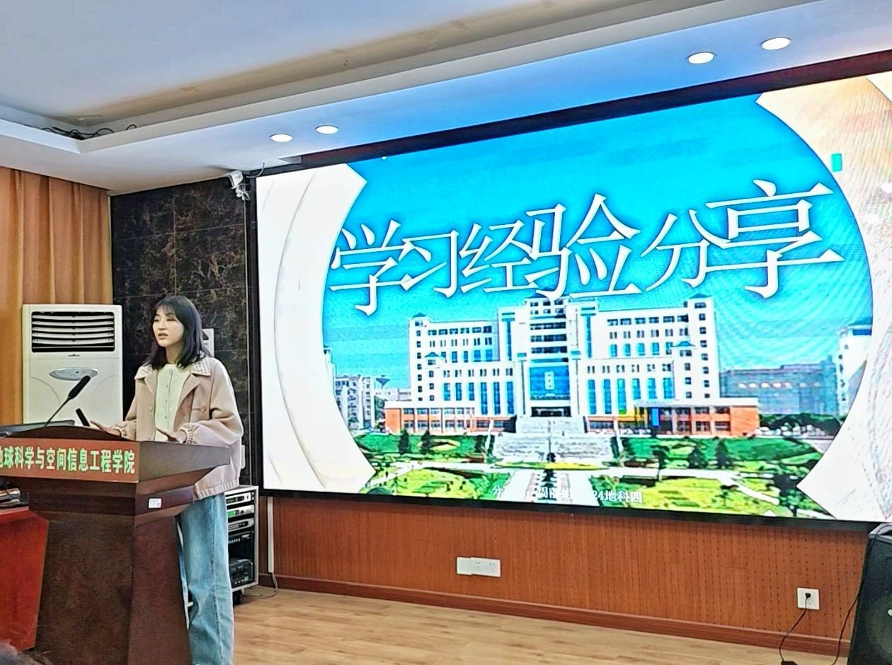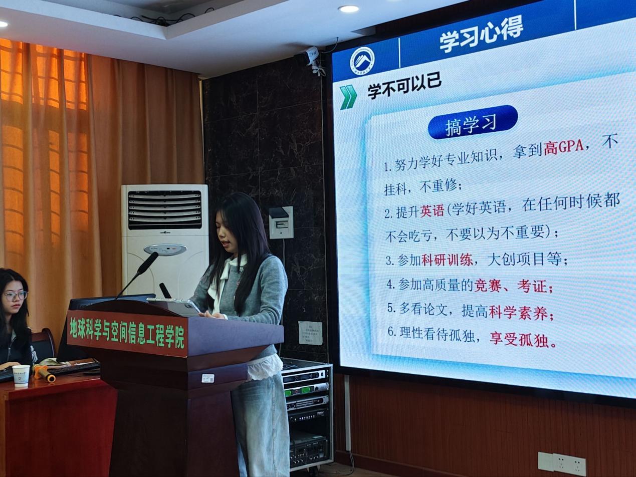 11月15日下午,地球科学与空间信息工程学院在院楼206室举办了优秀学生学习经验分享会。本次活动邀请了22 级李谨逸、24级周丽娟两位优秀学生进行分享,她们在台前侃侃而谈,给同学们带来了宝贵的学习经验和成长建议。