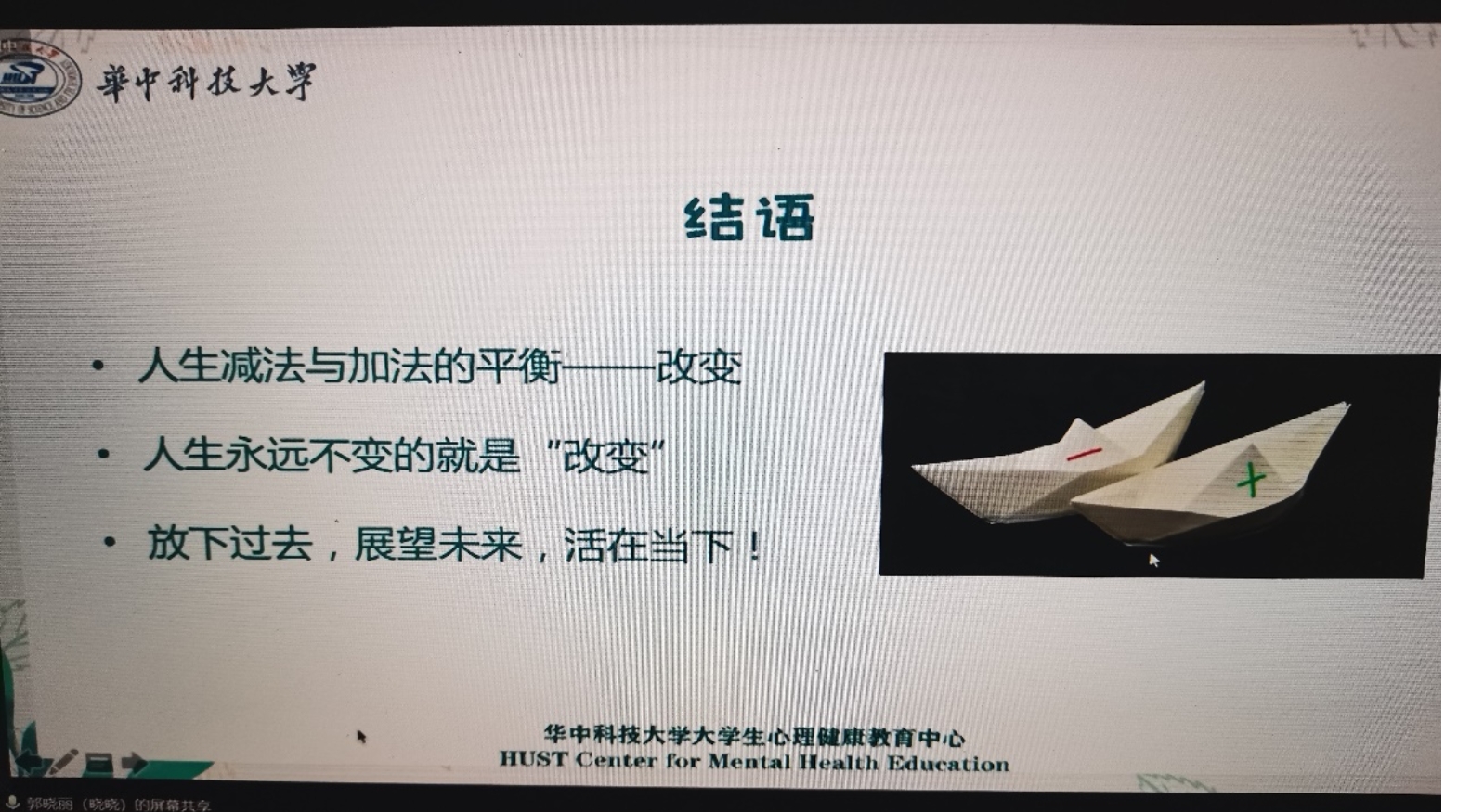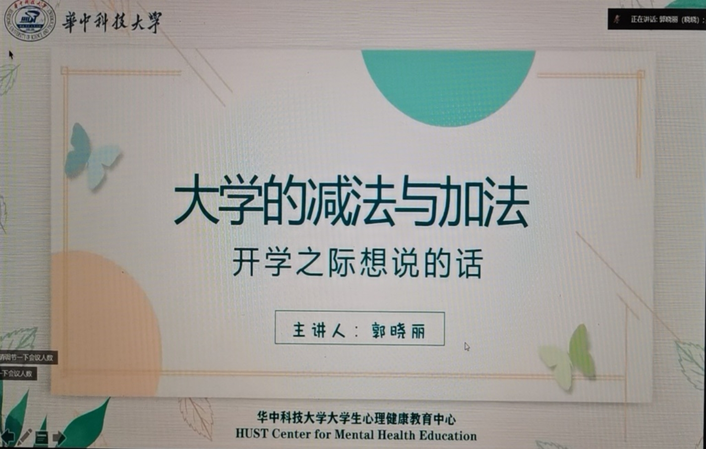 讲座上,郭晓丽老师以“大学的减法与加法—开学之际想说的话”为话题,用三个问题“我为什么要读大学”“在毕业时我希望自己和现在有哪些不同”以及“我希望以怎样的方式度过自己的大学”切入。首先郭老师介绍到底何为减法与加法,所谓减法加法是指在我们人生道路中,我们要学会取舍;当我们处在人生新的阶段和新的环境,我们需要学会做加法,当我们所熟知的方法不在适用时,我们学要做减法。接着,老师从新生适应的几个篇章来进行讲座,研究表明大新生在进入大学的第一个学期体验到的消极情绪随时间的延续有所增高,表现为抑郁与焦虑,大一新生从“陷入迷茫”到“走出困境”,46%的学生需要3个月左右的时间才可以完成;43%的大学生则需要1年左右的时间;而另外11%的学生则需要更长时间来调整自己。因此同学们需要做好关于学习、时间管理、人际、自我认识、家庭关系、休闲娱乐以及理财的加减法。其次以心理健康为内容,并指出心理健康的标准是一种幸福安康的状态,在这种状态下,每个人可以自我实现,能够应对生活中的正常压力,能够有效地工作,能够为集体做贡献;以及需引起关注的异常表现,对心理问题与求助的态度以及如何自助。因此,在日常学习和生活中,我们要学会自我调整,保持良好的心态,更快更好的适应大学新生活,但如果有问题、有麻烦时,要学会及时去进行戏里心理辅导;也要多多帮助周围有帮助需求的同学,让我们一起在阳光下茁壮成长。
