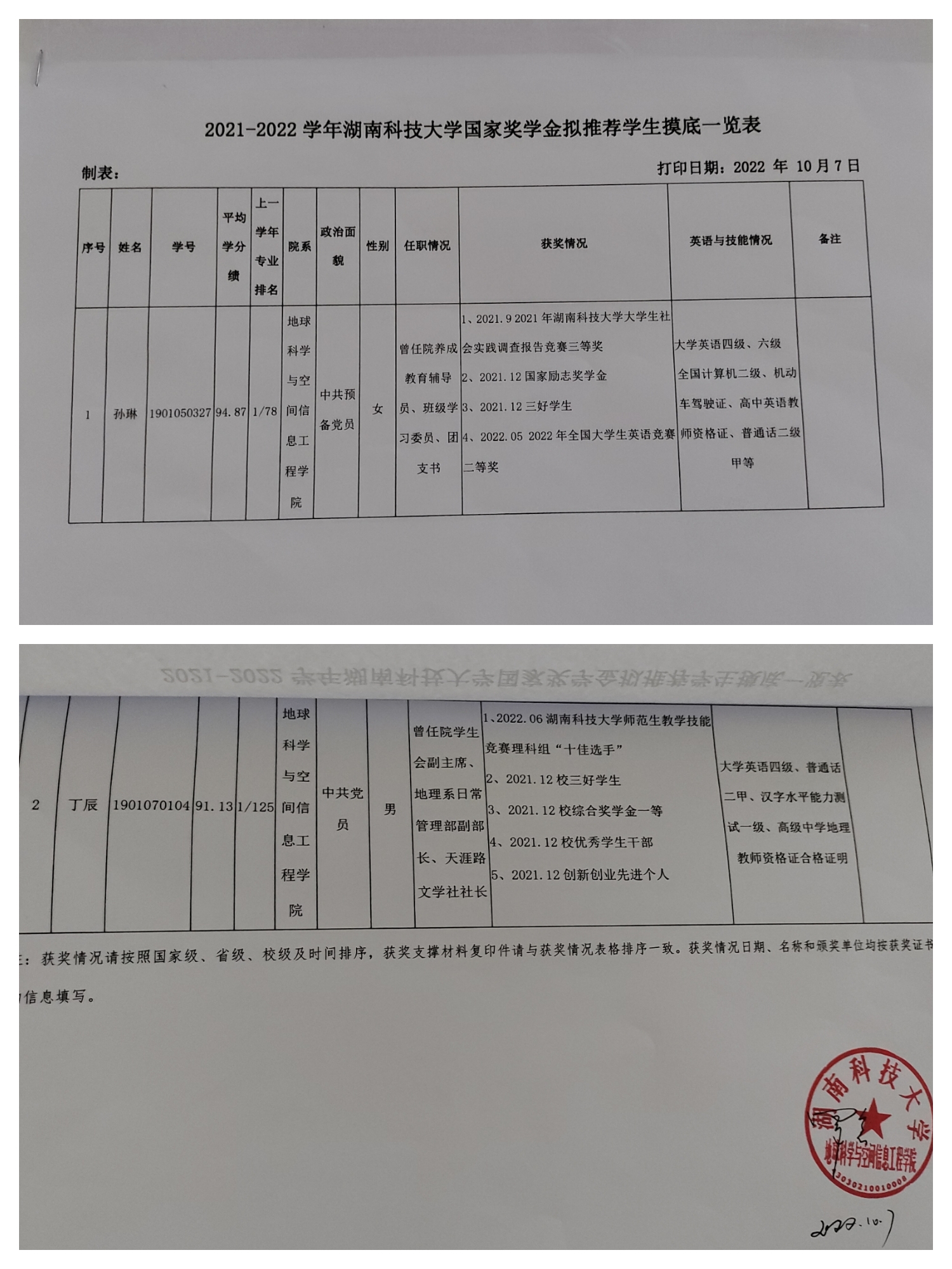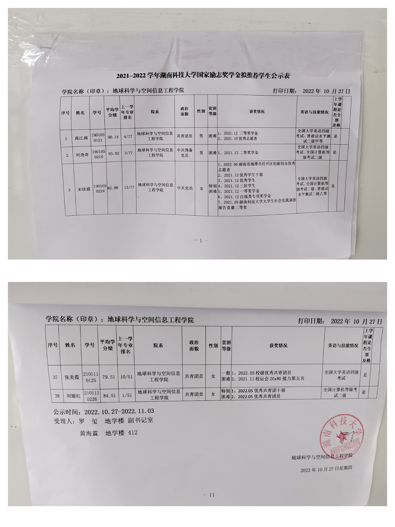 学院国家奖学金评审领导小组评审出2人,并将评审结果进行公示