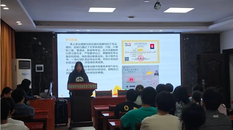 最后上台的是22地理科学2班的方璟。她首当其冲强调要保持学习成绩优秀,要保持绩点在专业排名前列。她提出学习重要的是要有学习方法,学会灵活掌握。其次她建议大家竞选班团或加入部门,通过干部工作学会有效和辅导员、班主任和同学们交流,处理生活和学习中的各种任务和情况。然后她建议大家多参加比赛,技能证书考试以及志愿活动,提高自己的自信心,培养自己的综合素养。