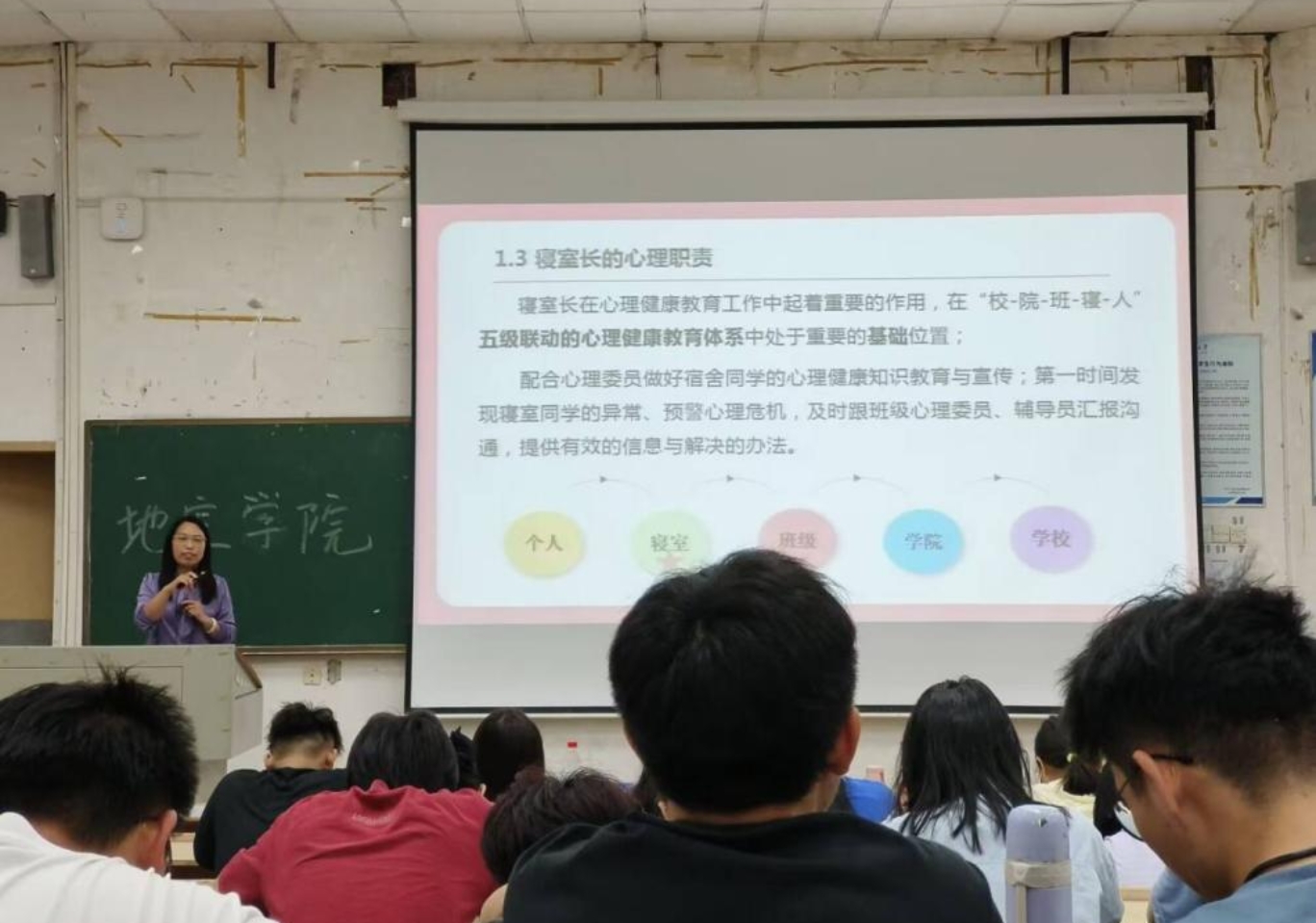 为了进一步落实寝室长工作职责,抓牢守住寝室单元安全底线,6月4日下午,地球科学与空间信息工程学院(以下简称“无码破解 ”)“心筑暖室,共享温馨”寝室长心理健康培训会在第五教学楼1-3教室顺利召开。校心健教育中心主任刘云峰、地空院心理专职辅导员吴小营、21年级辅导员罗杰以及学院全体寝室长出席本次会议。