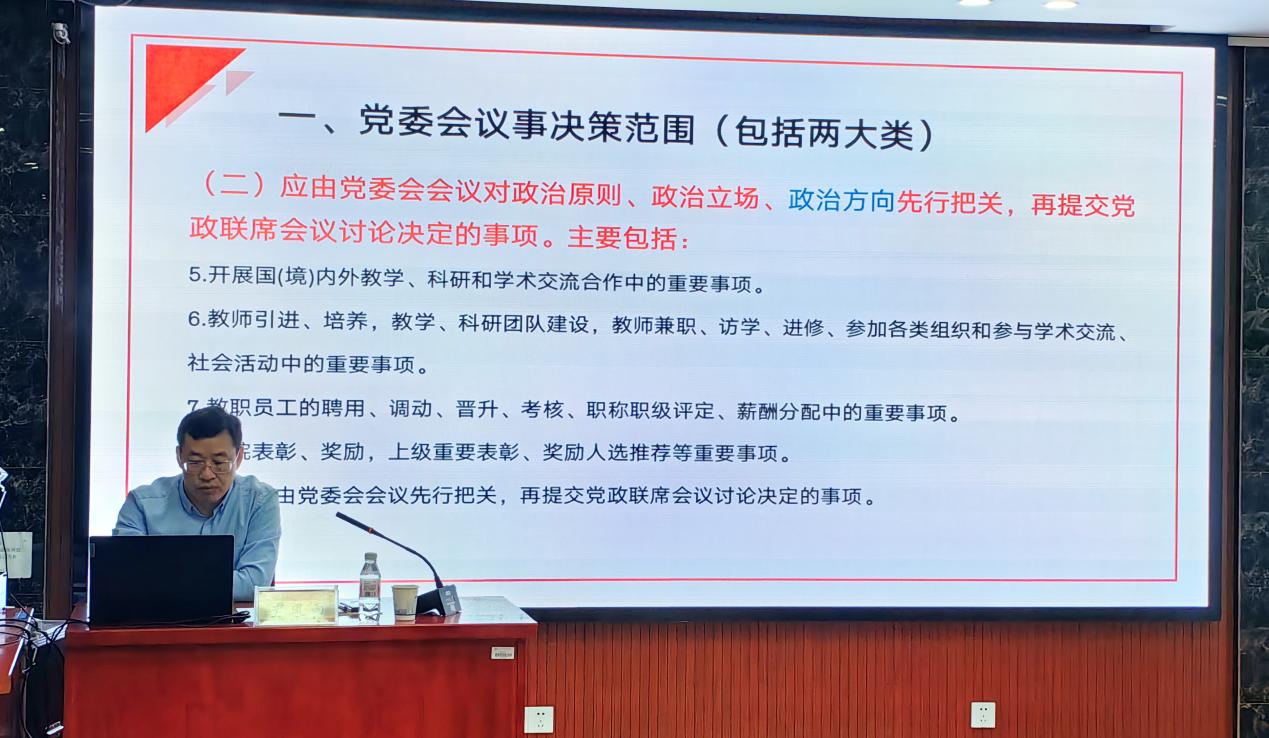 随后,党办校办尹风雨主任围绕“党委会、党政联席会会议决策范围以及教学院会议议事规则中存在的问题”等方面详细的为学员们进行了系统培训与解读。他表示,在党委会和党政联席会决策过程中,要坚持党的领导,确保决策符合党的路线方针政策和工作要求。在决策过程中,要充分听取群众与班子成员的意见,党政一把手要充分沟通,民主集中,确保一心为公、公平公正。