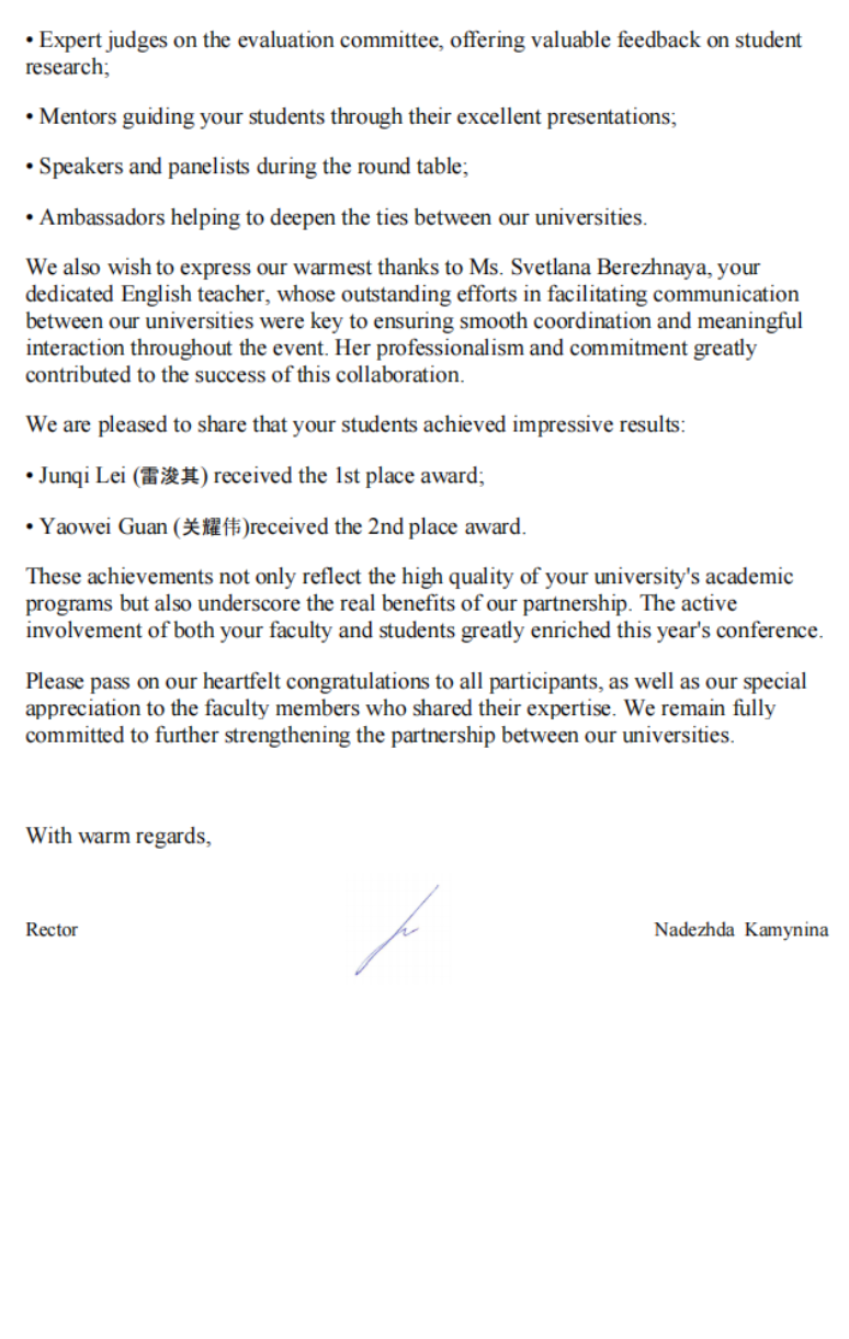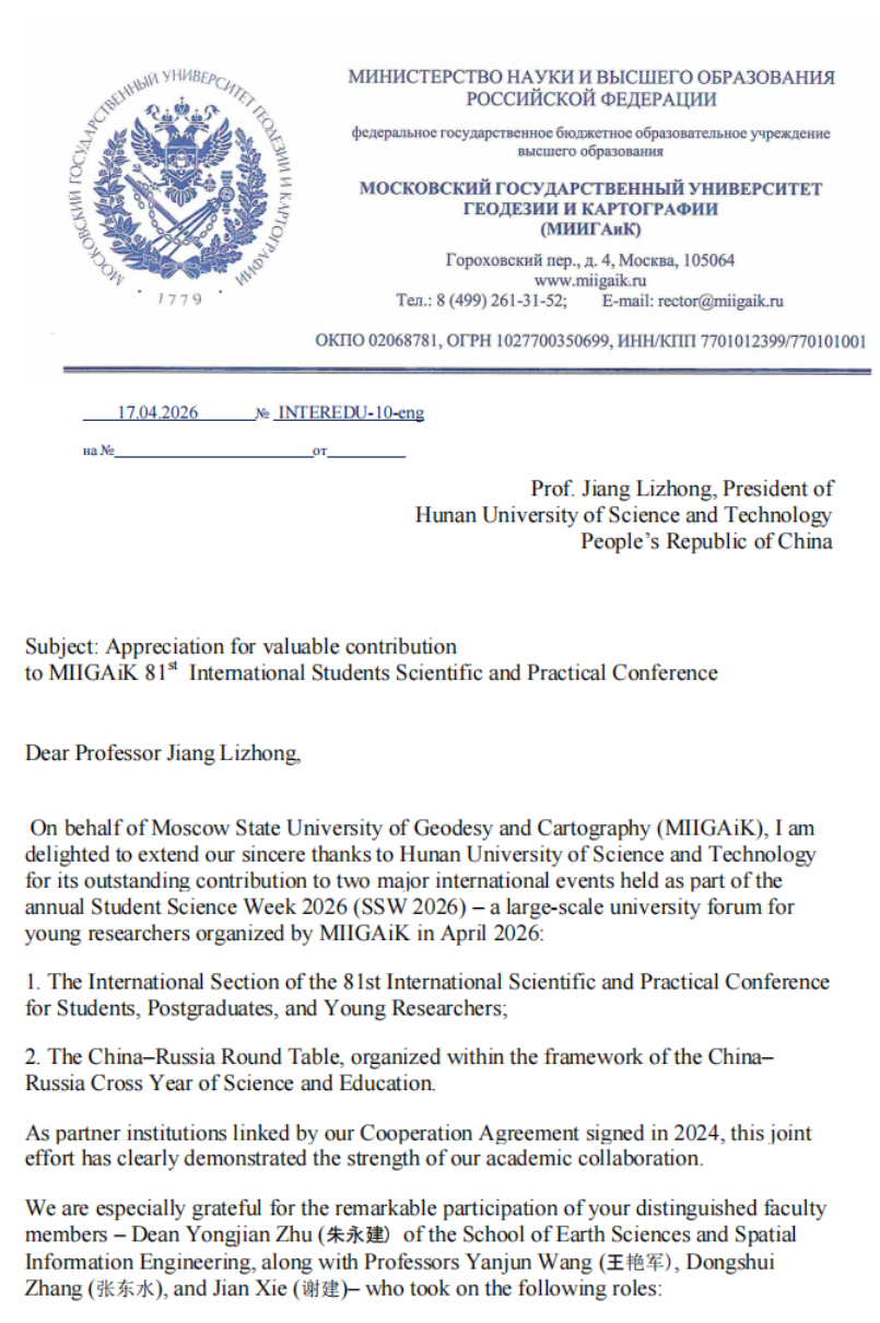 4月15日至16日,无码破解 与莫斯科国立测绘大学共同举办了第81届国际科学和实践线上研讨会“the 81st International Scientific and Practical Conference for Students, Postgraduates and Young Researchers, Student Science Week-2026 (SSW-2026)”,地球科学与空间信息工程学院院长朱永建教授在会上致辞,介绍了无码破解 “湖科大二号”卫星发射及学校“一站两中心”建设情况,建议两校在科教融合、人才培养方面开展全面合作。会后,莫斯科国立测绘大学给我校发来感谢祝贺信。