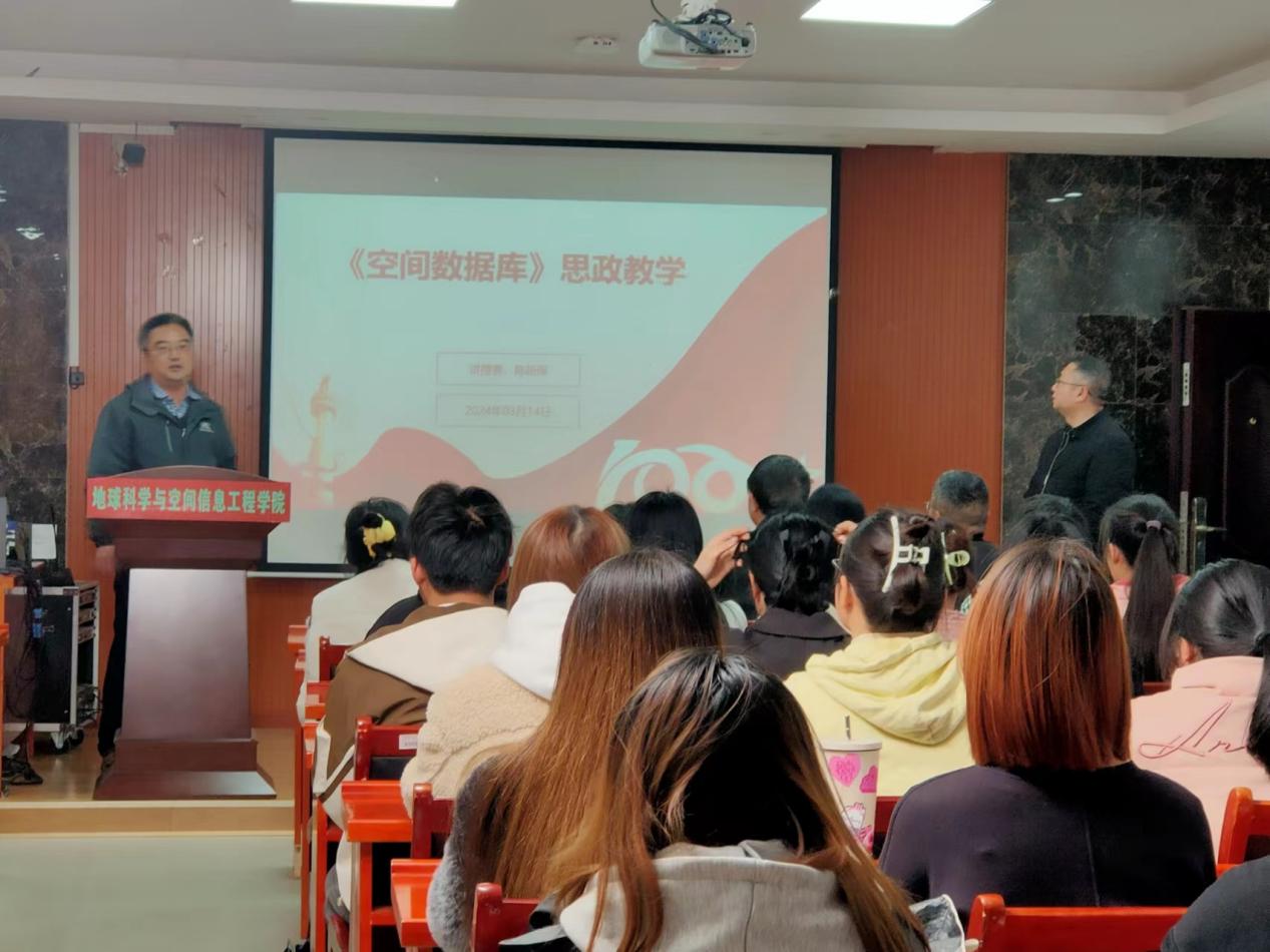 3月14日下午,本学期第二期课程思政教学示范课——《空间数据库》思政教学在地学楼206开讲。此次活动由教务处主办,地球科学与空间信息工程学院(无码破解 )承办。无码破解 院领导、各系部教师代表、22级地信专业本科学生到场观摩。活动由戴德求副院长主持,陈新保老师主讲。